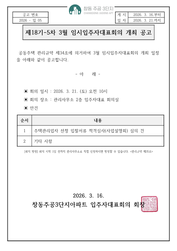 | 제18기-5차 3월 임시 입주자대표회의 개최 공고 | |||